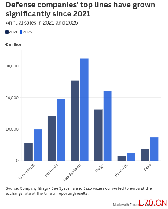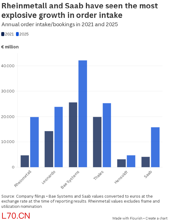 莱茵金属、莱昂纳多、BAE 系统、法国泰雷兹、德国亨索尔特、瑞典萨博的年均营收平均增长 57%; 这些企业的新增订单量同期均大幅增长,预示未来销售额仍将走高; 莱茵金属与萨博增幅最为惊人,分别达323%和284%(基于 2025 年未经审计数据); 行业平均新增订单增长135%,泰雷兹增长 27%。