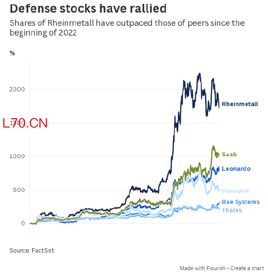 不过在发布业绩指引后,莱茵金属股价下跌 8%。杰富瑞分析师称该预期 “务实但偏温和”,并表示投资者对该股期望过高 —— 自 2022 年初以来,其股价已累计上涨1700%。