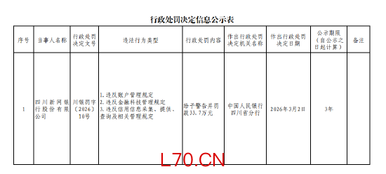 四川新网银行被罚33.7万元:违反账户管理规定等