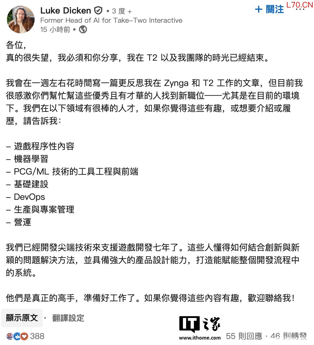 IT之家 4 月 3 日消息,据外媒 Kotaku 报道,Take-Two 近期对内部 AI 团队进行重组,负责该业务的负责人 Luke Dicken 已在领英发帖确认离职,并表示对 Take-Two 的所作所为感到失望。