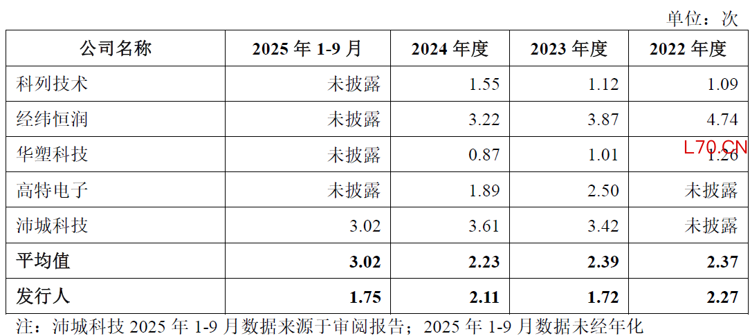报告期内,公司应收账款周转率分别为2.27 次、1.72 次、2.11 次和 1.75 次,持续低于同业可比公司平均水平。2025 年前三季度,公司应收账款周转率为行业均值的57.95%,回款效率落后于同行。