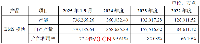 然而,公司当前产能利用率已明显下滑,呈现 “产能过剩初现” 的迹象。数据显示,2024 年公司BMS模块产能利用率曾达99.61%,但2025年前三季度已降至77.44%,下滑超22个百分点。