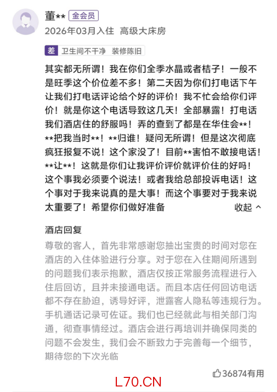 对于这条差评,涉事酒店在评论下回复称,“对于您在入住期间所遇到的问题我们表示抱歉,酒店仅按正常服务流程进行入住后回访,且并未接通电话。而且本店任何回访电话都不存在胁迫,诱导好评,泄露客人隐私等违规行为。手机通话记录可佐证。我们也已经就此与相关部门沟通,彻查事情经过。酒店会进行再培训并确保同类的问题不会发生,我们会不断致力于完善每一个细节,期待您的下次光临。”