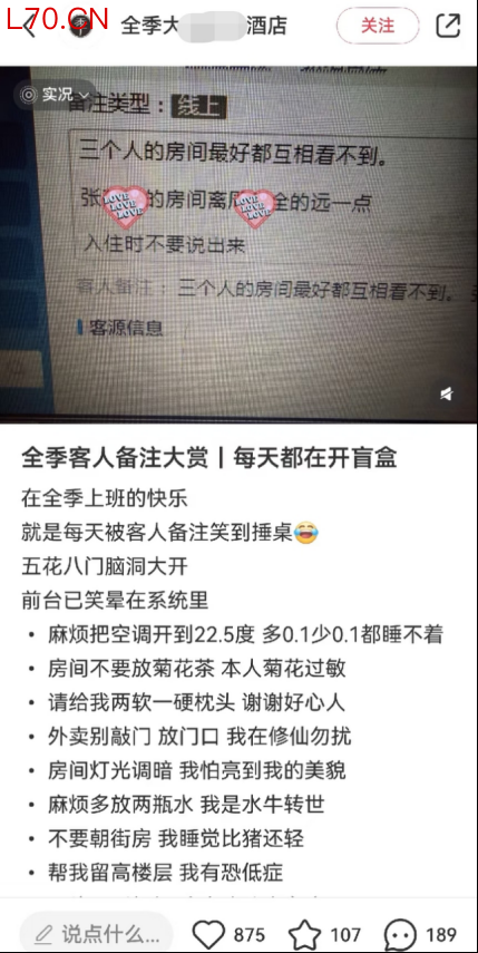同样在今年4月,一则“全季客人备注大赏”的帖文出现在社交平台,引发公众对酒店客户信息安全与隐私保护的广泛热议。据悉,一个名为“全季大连××酒店”的社交账号,发布了客人入住订单特殊备注内容,并配以“每天被客人备注笑到捶桌”“前台已笑晕在系统里”等文案,将客人个性化入住需求发在网上。