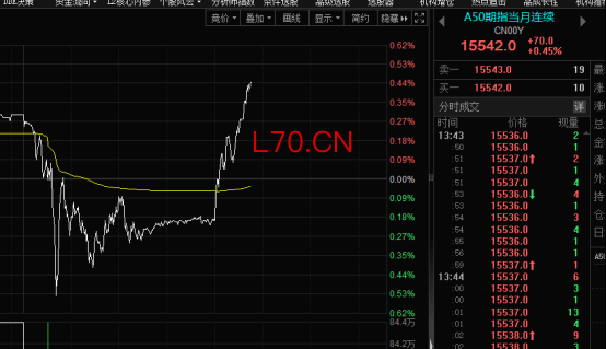 A50午后直线拉升,一度由跌转涨反弹近0.5%,恒指期货则反弹超0.5%。