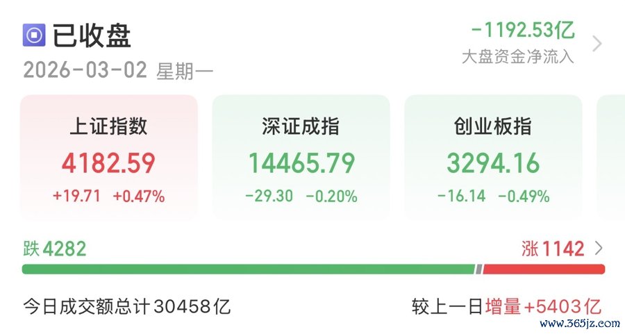 A股实际开市后的表现,与规律基本一致——截至3月2日收盘,沪指低开后在盘中激烈博弈成功翻红,报4182.59点,涨0.47%,展现出强大韧性。深证成指、创业板指小幅收跌,分别报14465.79点、3294.16点,收跌0.2%、0.49%。