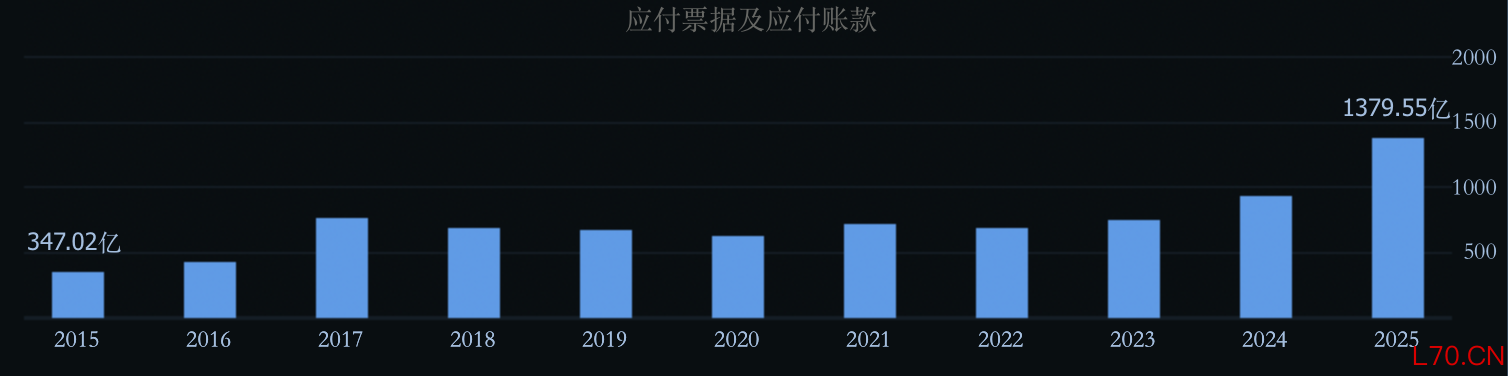 除了现金流被大量挤占,工业富联未来需要支付的款项规模同样惊人。例如,公司2025年末的应付票据及应付账款高达1379.55亿元,远高于2024年末的938.35亿元,同比增幅约47%。这也是该数据自公司成立以来首次迈过千亿门槛。