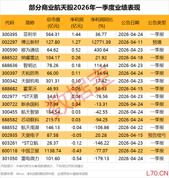 据证券时报·数据宝统计,截至4月24日,已有17只商业航天股发布2026年一季度业绩相关报告。按一季报及业绩快报中值来看,菲利华(300395)、博云新材(002297)净利润规模逾亿元,分别为1.44亿元、1.27亿元;移为通信(300590)、纳睿雷达净利润依次为5192.99万元、2641.55万元。